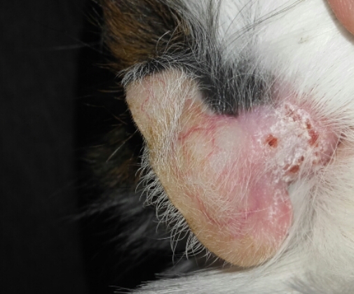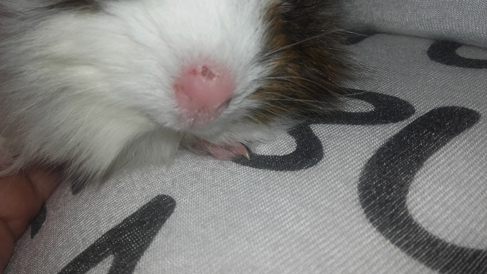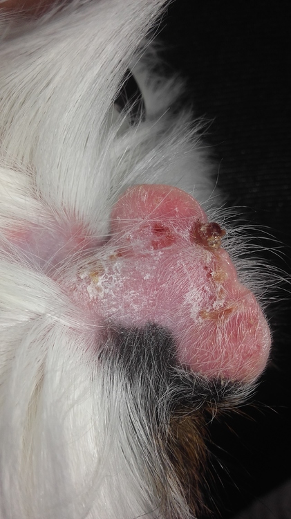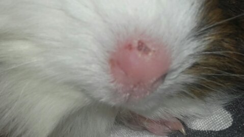 Salve a tutti la mia cavietta trilly di 2 mesi presa da moby dick portata a casa ci siamo accorti che sull orecchio e sul musetto aveva delle croste ricoperte di biancastro intorno ,preoccupata l ho portata dal veterinario che esaminando al vetrino un pezzettino di pelle tolto con il bisturi ha riscontrato la rogna parte con la prima puntura ma lei continuava a devastarsi l orecchio grattandosi in continuazione quindi mi sono fatta forza e con un batuffolo di ovatta impregnato di acqua ossigenata gli ho disinfettato l orecchio poverina ha gridato un pochettino ma ritornati x la seconda puntura il veterinario mi ha fatto i complimenti x la giarigione fatto sta che dove gli ha fatto la puntura mentre l accarezzavo ho sentito un rigonfiamento che con il passare dei giorni si e trasformato in una pallina dove ieri sera mentre gli facevo il bagnetto e l asciugavo con il phon mancano dei peli e in piu sotto la pancina sembra come se abbia un quadratino duro questi giorni e molto nervosa e perde un sacco di peli devo aspettare lunedi x il veterinario con il fatto che e la mia prima cavia forse sbaglio io qualcosa ??nella sua gabbiona metto fieno la rotellina di sale frutta secca e nn so cosa siano ma me le ha date il negozio sembrano dei bastoncini verdi piccolini e poi 100ml di acqua con 10 gocce di vitamina c