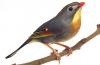 Questo è l'usignolo del Giappone (Leiothrix lutea): Questo uccellino è distribuito dalla Cina meridionale e dalla Birmania fino al Kashmir sud-orientale. In Italia sono state effettuate numerose osservazioni (anche alcune nidificazioni), principalmente dovute a fughe dalla cattività: avvistamenti a Novara, Pesaro, Venezia, Lucca (Monte Pisano). In Italia è considerata una specie ormai naturalizzata. E' possibile che tu abbia effettivamente visto un piccolo stormo di questi uccellini.